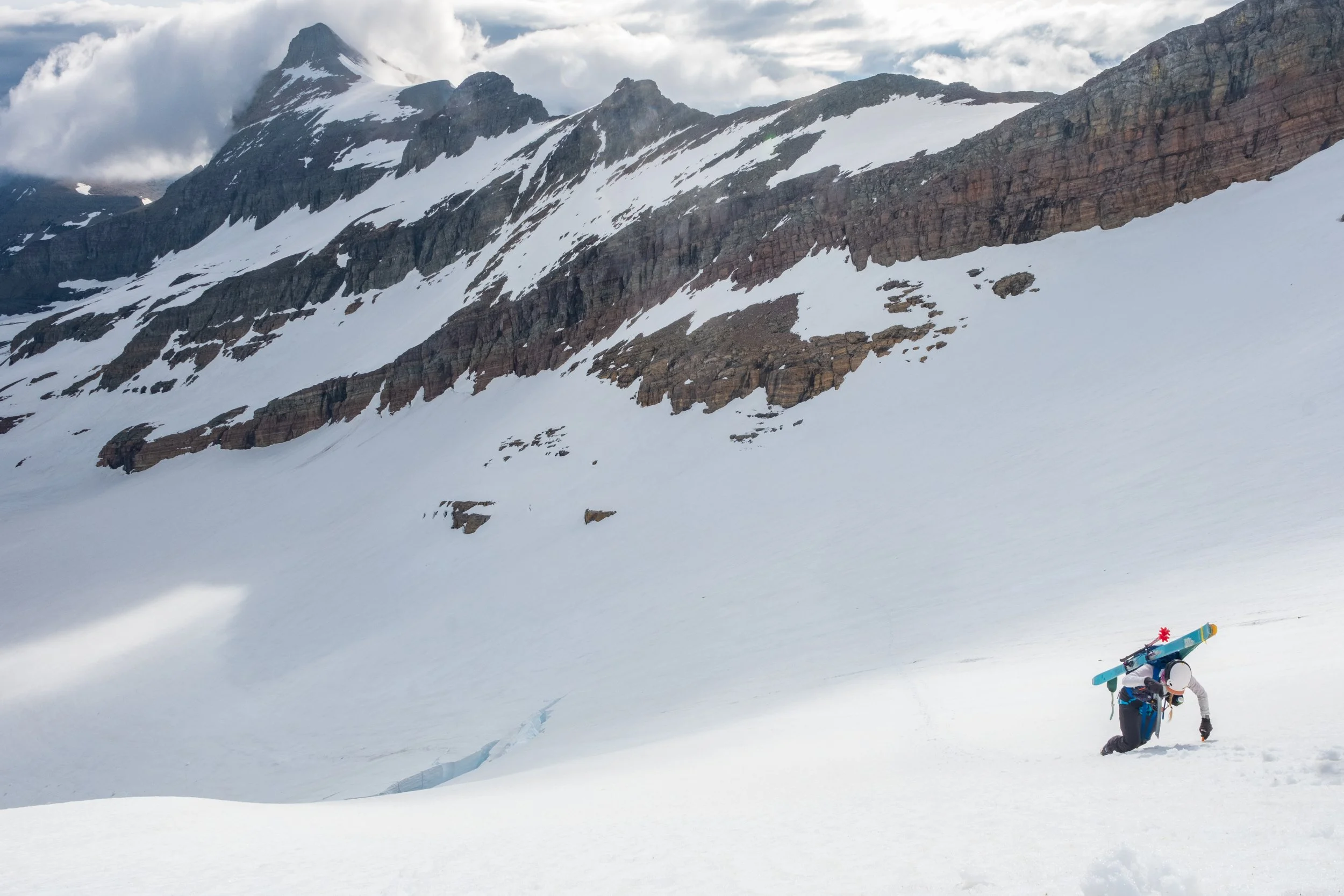 After reaching snow line we donned our skis (finally some weight off our backs!) and worked our way through the vast glacier basin. The skies were growing darker and worries of rain increased, but luckily the weather seemed to be staved off by the big mountain that dominates the sky in this area.